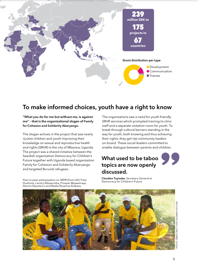 DBF och samarbetsorganisationen FCS Abaryango som verkar i flyktinglägret Nakivale Refugee Settlement finns omnämnda i Forum Civs årsrapport för 2021. I projektet som slutade i mars 2021 har vi utbildning ungdomsambassadörer inom reproduktiv och sexuell hälsa och de har i sin tur nått ut till ett stort antal burundiska flyktingar i lägret.